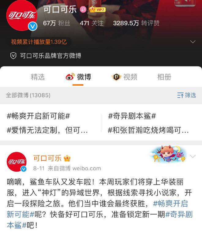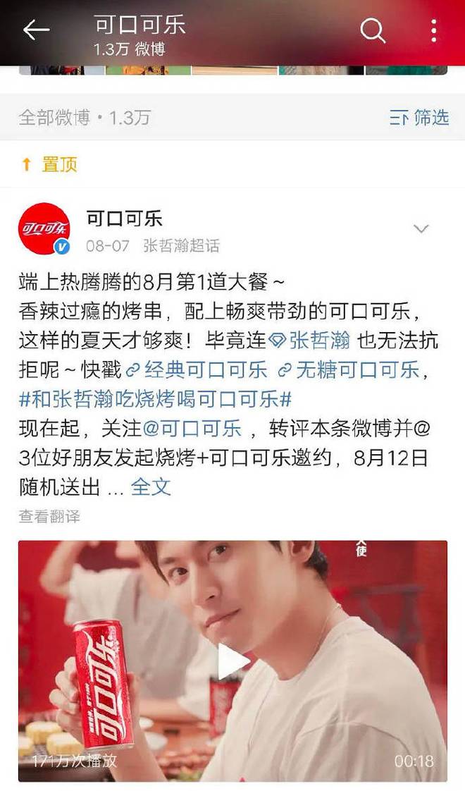 可口可乐将此前置顶的由张哲瀚拍摄的视频换掉。