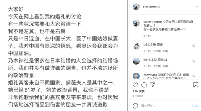 随后,张哲瀚朋友在ins道歉并为张哲瀚澄清:“乃木神社是很多日本结婚的人会选择的场所,我们并没有做详细的调查,也并不了解场所的背景”“非常抱歉给我们的嘉宾朋友带来麻烦,也对因我们场地选择而受到伤害的朋友一并真诚道歉。