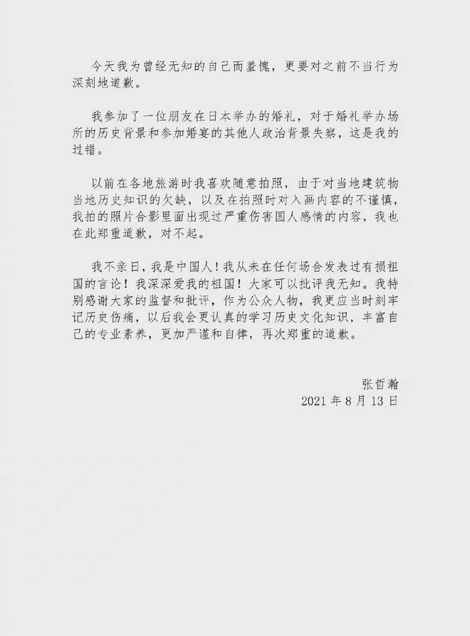 13日,在日本照片风波持续发酵,张哲瀚针发文致歉:“为曾经无知的自己而羞愧,更要对之前不当行为深刻地道歉。”他表示自己旅行时喜欢随意拍照,对当地建筑的历史知识欠缺所致并表示自己不亲日是中国人。