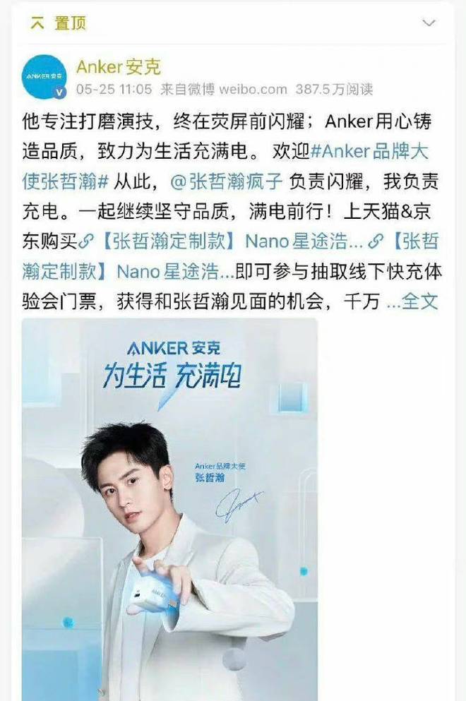由张哲瀚担任品牌大使的Anker安克也已将此前置顶的博文换下。