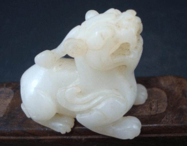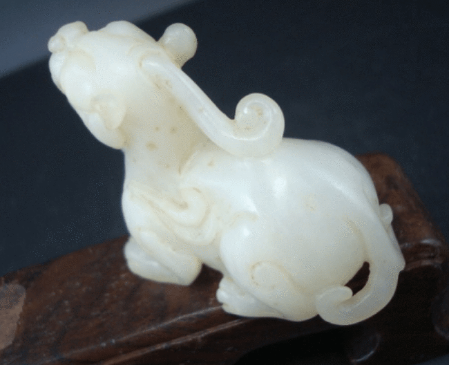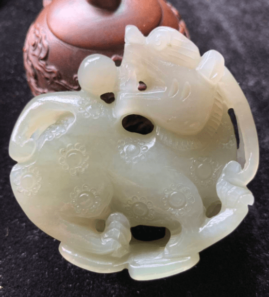然后就是看这个貔貅的材质,和田玉材质这样细致温和,表层有油脂光泽。别的玉石的滋养和植物油脂光泽度是没有办法和和田玉相比的。并且把这个貔貅放在皮肤,感觉有一种凉爽的触感,但是像那种玻璃钢的制品或者是假的东西,是没有这种触感的。