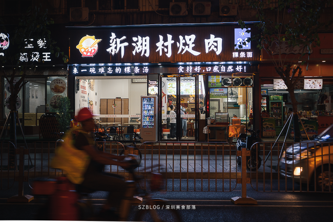 店由叶阿姨和胡叔这对来自潮汕的夫妇经营,24小时营业,白天店由叶阿姨管,晚上则为胡叔负责。这店之前名为福景早餐,最近这几年他们才将它改名为新湖村(火足)肉。
