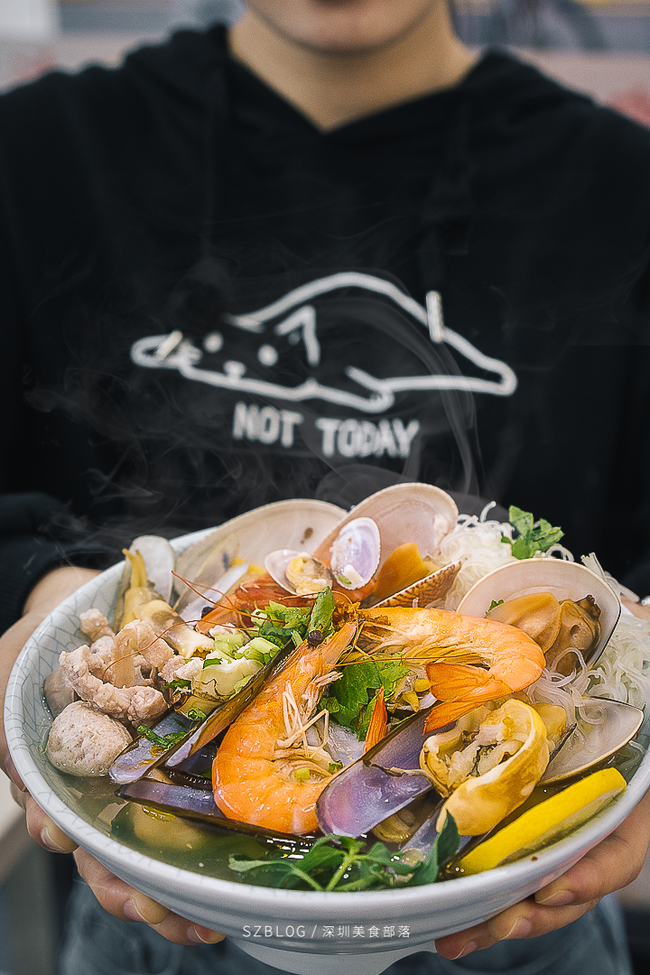 刚出锅的促肉粉, 老板说一定要趁热吃。海鲜和肉占据了它的大半江山,肉质鲜嫩爽滑,粉丝细软有弹力,在鸡汤加持下,稍带醇香浓厚的滋味。建议点菜时要量力而行,最后这碗粉真把我吃撑了!
