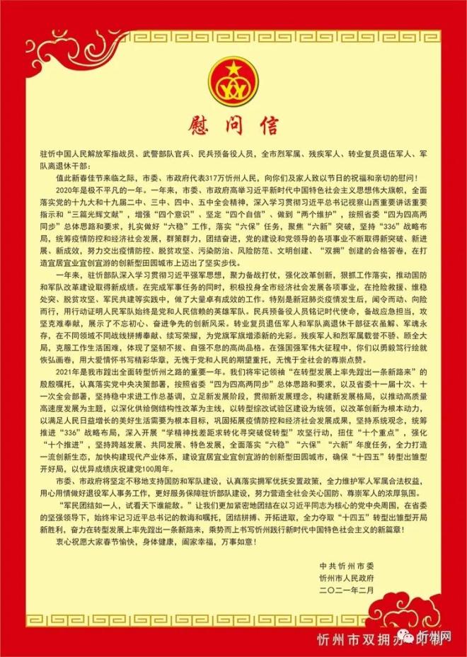 原标题:《忻州市委市政府向驻忻部队全体官兵 退役军人和其他优抚对象发出慰问信》