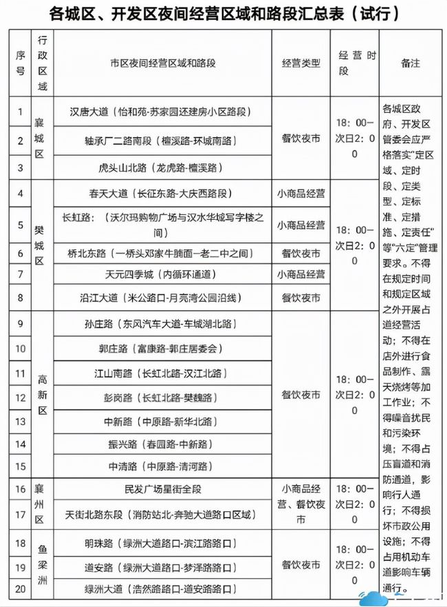 今日,襄阳市城市管理执法委员会发布通知,将在20个地方开展夜市试点,涉及襄城、樊城、襄州、高新…